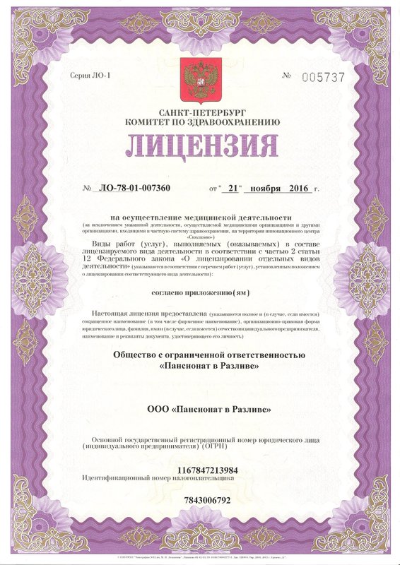 Хотим выразить большую благодарность руководству Пансионата в Разливе в лице Ирады Анатольевны, врачу Виталию Антоновичу, медсестрам, сиделкам, поварам и добрым уборщицам. Удивительные люди работают в вашем пансионате! Наша мама прожила здесь пять с лишним лет, с заболеванием старческая деменция альцгеймеровского типа. Навещать ее мы приезжали в разное время суток, и всегда мама была ухожена, опрятна в прекрасном настроении. Мы сами не смогли бы, при всем желании, дать ей необходимый уход, учитывая ее заболевание. В хорошую погоду мамочку мы заставали на улице на скамеечке. В праздники мы попадали на прекрасные концерты и мероприятия. Даже было время, когда все жители пансионата пели, благодаря инициативы бабушки, играющей на фортепиано. После того, как она не смогла больше петь, мы стали петь с мамочкой сами. Особенно она помнила «Ладогу» и «Волховскую застольную». Низкий поклон всему персоналу!